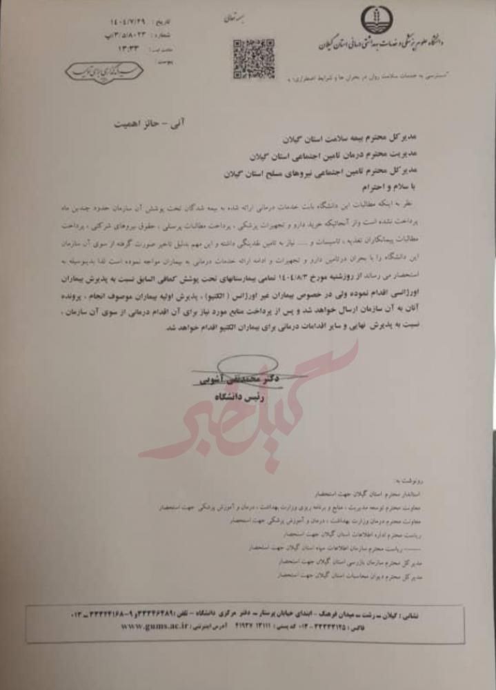 دکتر آشوبی در این نامه که توسط گیل خبر منتشر شده، تاکید کرده، این تصمیم به دلیل تداوم مشکلات مالی و عدم پرداخت بدهی بیمهها به دانشگاه علوم پزشکی گیلان اتخاذ شده است.